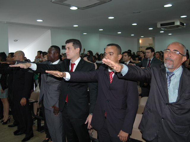 Na manhã desta terça-feira (21), a Ordem dos Advogados do Brasil Seção Bahia (OAB-BA) entregou carteiras da OAB-BA a 80 novos advogados, em solenidade realizada em sua sede, nos Barris. A cerimônia começou às 10h e contou com a presença dos novos profissionais e de seus familiares, que lotaram o auditório da Ordem. A secretária-geral da OAB da Bahia, Ilana campos, presidiu a mesa alta e abriu a solenidade saudando os novos profissionais e sua famílias. Em seguida, o conselheiro seccional Alexandre Brandão Lima fez a saudação aos novos advogados. A bacharel Juliana Leite Palmeira Santana fez a leitura do Compromisso do Advogado, acompanhada pelos colegas. Também compuseram a mesa alta, o diretor tesoureiro Jones Rodrigues, o conselheiro seccional Daniel Athayde, o ouvidor-geral Adilson Affonso de Castro, a presidente da Comissão de Informática Jurídica Tamiride de Monteiro Leite, Gonçalo Porto da Silva Neto, Antonio Costa Nery e Walter Ribeiro Junior.