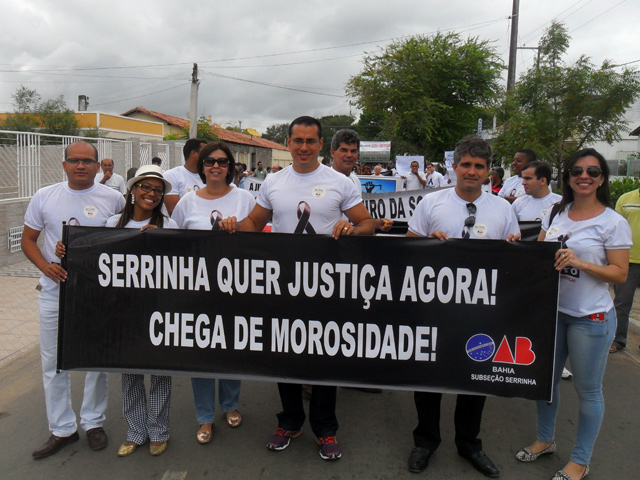 Depois de Jacobina, Barreiras e Feira de Santana, foi a vez dos advogados de Serrinha protestarem contra a crise do Judiciário baiano. A Subseção da OAB de Serrinha, no nordeste do estado, com o apoio da OAB da Bahia, promoveu na manhã desta quarta-feira (30) uma mobilização pelas ruas da cidade para denunciar a morosidade e a desorganização do Judiciário na região. Além da falta de juízes e servidores, a falta de estrutura do Fórum Luiz Viana Filho e a má prestação jurisdicional, em desrespeito à advocacia e à sociedade. Participam do ato público "Mais Justiça" o vice-presidente da OAB da Bahia Fabrício Oliveira e o presidente da Subseção de Serrinha Sabino Gonçalves Neto.Segundo Sabino Gonçalves Neto, a mobilização em Serrinha foi decidida no último Colégio de Presidentes de Subseções da OAB da Bahia e teve como objetivo apresentar à sociedade a situação caótica da Justiça nesta e nas outras 30 subseções da OAB no estado da Bahia. "O Tribunal de Justiça da Bahia demonstra não ter condições de manter a estrutura que se propõe a manter. Uma audiência de conciliação no juizado de Serrinha está sendo marcada para daqui a um ano. No meu escritório, tenho audiência marcada para março de 2018. Um prazo de cinco anos, o que é inadimissível. Essa Justiça lenta não é Justiça, é injustiça. Se o Tribunal não conseguir melhorar a prestação jurisdicional será melhor que feche logo as portas. Então é contra esta Justiça morosa, ineficaz, que nós estamos protestando", declarou Sabino.