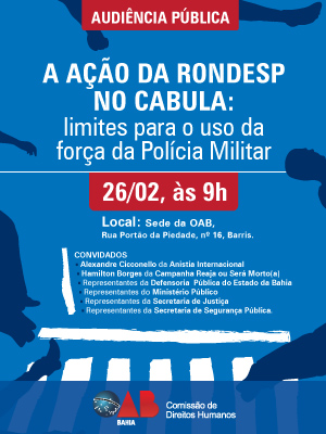 Na próxima quinta-feira (26), a partir das 9h, a OAB da Bahia promove a audiência pública "A ação da Rondesp no Cabula: limites para o uso da força da Polícia Militar". O evento vai discutir a ação da PM na Vila Moisés, periferia de Salvador, no Cabula, na madrugada do dia 6 de fevereiro, que resultou na morte de 13 homens e ferimentos em outros três, inclusive um policial militar. O evento acontece no auditório da OAB-BA, nos Barris.