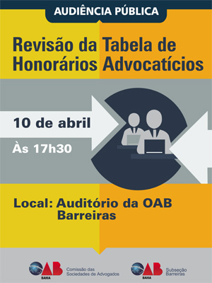 A OAB da Bahia realiza em Barreiras, na quinta-feira (10), a partir das 17h30, audiência pública para debater a "Revisão da Tabela de Honorários Advocatícios". Promovida pela Comissão das Sociedades de Advogados, a audiência é dirigida aos os advogados da região e acontece no auditório da subseção da OAB de Barreiras, na Rua Marcos Freire, nº 557, bairro Villa Regina.