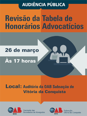 A OAB da Bahia realiza em Vitória da Conquista, nesta quarta-feira (26), a partir das 17h, audiência pública com a finalidade de debater a Revisão da Tabela de Honorários Advocatícios da OAB da Bahia. Promovida pela Comissão das Sociedades de Advogados, a audiência, que é aberta a todos os advogados, acontece na sede da subseção da OAB de Vitória da Conquista, na Rua Rotary Club, nº 103.