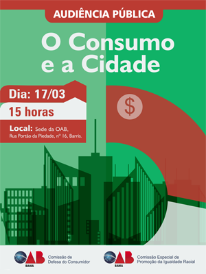 A Comissão Especial de Defesa do Consumidor da OAB da Bahia promove na próxima segunda-feira (17) a audiência pública "O Consumo e a Cidade". O objetivo é debater o crescimento econômico como uma oportunidade de garantir o acesso da população a bens e serviços essenciais e provocar uma reflexão sobre como garantir uma relação de consumo mais ética, transparente, justa, sustentável e tranqüila no atual cenário da economia brasileira que possibilitou a inclusão de milhões de consumidores no mercado.