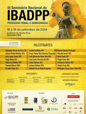 Pelo terceiro ano consecutivo, o Instituto Baiano de Direito Processual Penal (IBADPP) promove seu Seminário Nacional. O congresso deste ano contará com participação de alguns dos maiores processualistas e penalistas brasileiros, além de três prestigiados juristas europeus. O processo penal e a internet, o uso do processo penal para a repressão de manifestações populares, o caso “Mensalão” e a relação entre direito penal e processo estão entre os temas a serem debatidos. O evento acontecerá no auditório do Mundo Plaza, com conferências dos professores Jesús-Maria Silva Sánchez (Espanha), Manuel Cancio Meliá (Espanha) e Manuel Monteiro Valente (Portugal), e palestras dos professores Aury Lopes Jr. (RS), Alexandre Morais da Rosa (SC), Geraldo Prado (RJ), Luciano Feldens (RS), Marcelo Semer (SP), Jacinto Coutinho (PR) e Juarez Tavares (RJ).