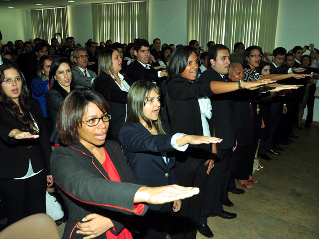 Na tarde desta segunda-feira (26), 83 novos advogados receberam suas carteiras da Ordem dos Advogados do Brasil Seção Bahia (OAB-BA) em solenidade realizada na sede da Ordem, nos Barris. A cerimônia começou às 15h, com o auditório lotado pelos novos profissionais e seus familiares. A secretária-geral da OAB da Bahia, Ilana campos, presidiu a mesa alta e abriu a solenidade parabenizando os novos profissionais e sua famílias. Em seguida, o diretor da Escola Superior de Advocacia Orlando Gomes (ESA-BA) Luiz Augusto Coutinho fez a saudação aos novos advogados. Acompanhada pelos colegas, a bacharel Juliana Gomes Varjão fez a leitura do Compromisso do Advogado. Compuseram a mesa alta, os sdvogados Rafael Souza de Oliveira, Jefferson Oliveira Ferreira, Gérson Almeida Gusmão, Rita de Cássia Nascimento Correia, Jamil Cabus, o bacharel Mário Sérgio Dias Correia e a advogada e vereadora Ana Rita Tavares.