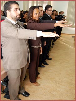Exortações sobre dignidade profissional e constante estudo do Direito marcaram a solenidade de entrega de carteiras a 81 novos advogados, na tarde de hoje (7), no auditório da Seccional baiana, na Piedade. Realizado num recinto lotado, o evento que foi aberto pelo presidente da Ordem dos Advogados do Brasil-Seção Bahia (OAB-BA), Saul Quadros, contou com palavras entusiasmo, proferidas pelo orador convidado para a cerimônia, o advogado Joaquim Artur Pedreira Franco.