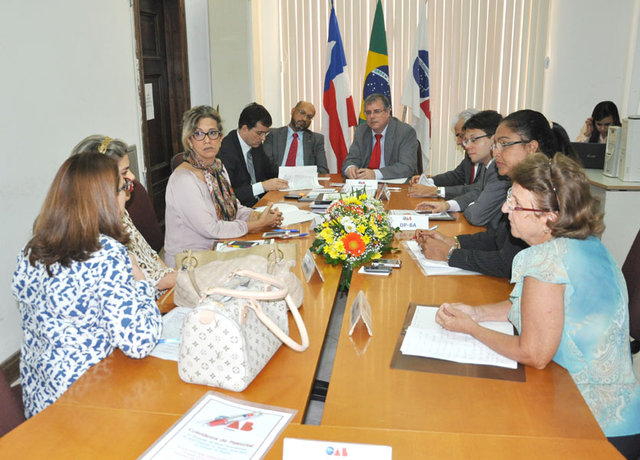 Estiveram presentes no encontro, o presidente da OAB Bahia Luiz Viana Queiroz; o assessor da presidência do Tribunal de Justiça da Bahia, Claudio Cesare; a presidente da Associação dos Magistrados da Bahia - AMAB, Nartir Dantas Weber e sua sucessora, eleita para a gestão de 2014-2015, Marielza Brandão Franco; o representante do Ministério Público da Bahia, Valmiro Santos Macedo, o representante da Defensoria Pública do Estado da Bahia, Ussiel Elionai Dantas Xavier Filho, a representante da Associação dos Defensores Públicos do Estado da Bahia - ADEP, Camila Angélica Canário de Sá Teixeira e as coordenadoras de finanças e dos aposentados do Sindicato dos Servidores dos Serviços Auxiliares do Poder Judiciário do Estado da Bahia – SINTAJ, Ana Lúcia Oliveira e Ana Lúcia Penalva. Foto: Angelino de Jesus/OAB-BA