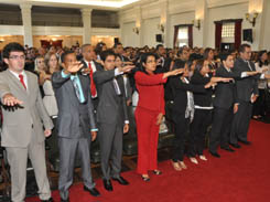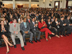 A leitura do compromisso foi feita pela bacharela Caroline Barbosa Batista, que obteve a melhor nota da turma. Em seguida, teve início a entrega das carteiras. O filho da primeira-dama do Estado, Eduardo Mendonça Sodré Martins, recebeu de Fátima Mendonça e do governador Jaques Wagner a carteira da Ordem. Compuseram também a Mesa Alta da Solenidade o Vice-Presidente da Seccional, Antônio Menezes, o Diretor Tesoureiro Ary Moreira, o Secretário-Geral Adjunto André Godinho, a Presidente da Comissão de Estágio e Exame de Ordem, Chistianne Gurgel, os conselheiros seccionais João Dantas, João Amaral e Otávio Miranda, o advogado e Secretário de Estado Fernando Schmidt, o desembargador Marcos Gurgel, além de Expedito Teixeira de Carvalho e José Nolasco.