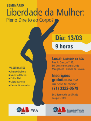 A Comissão de Proteção aos Direitos da Mulher da OAB da Bahia promove no dia 13 de março o seminário "Liberdade da Mulher: Pleno Direito ao Corpo?", em homenagem ao Mês da Mulher. O evento acontece às 9h, no Auditório da Escola Superior de Advocacia Orlando Gomes, no Centro de Cultura João Mangabeira, na Rua do Carro, nº 136, ao lado do Fórum Ruy Barbosa.